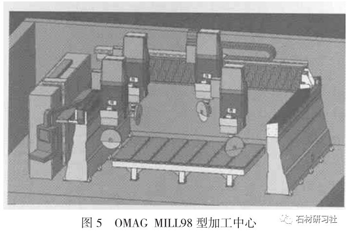 由于有關技術和關鍵的問題還未得到完全徹底解決,故在國內石材加工中還沒得到廣泛應用,也顯著提高了石材制品的加工效率。圖5為意大利OMAG公司的MILL98型加工中心工作模擬圖,該加工中心同時配備了4個工作頭。