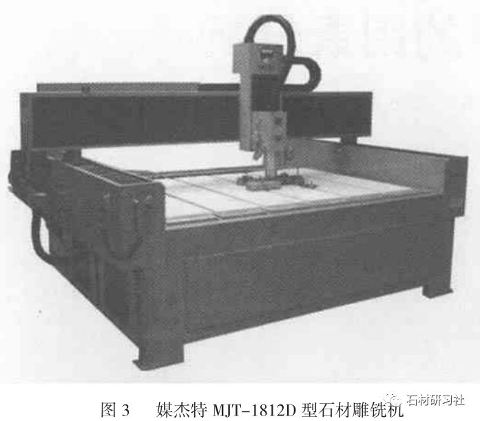 圖3為國產美杰特MJT-1812D型石材雕銑機主 要用于墓碑加工,其最大加工尺寸為:寬2700mm、 長2100mm、高1800mm,最大加工質量為: 1500kg。