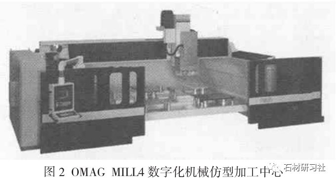 圖2為意大利0MAG公 司MLL4型3到6軸的數(shù)字化機械仿型加工中心, 這套加工中心集鋸、雕刻、打磨、轉銑于一體。